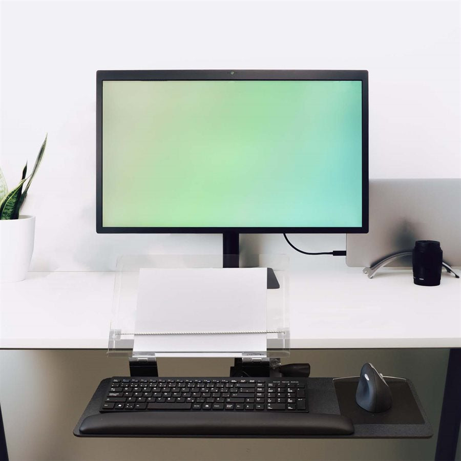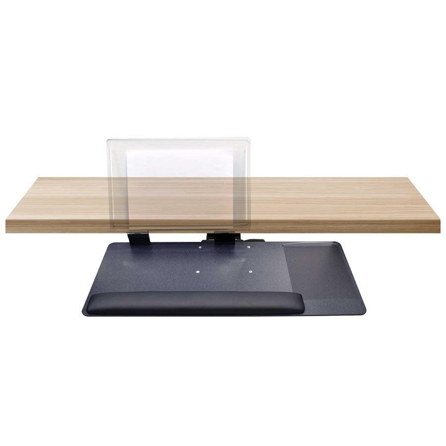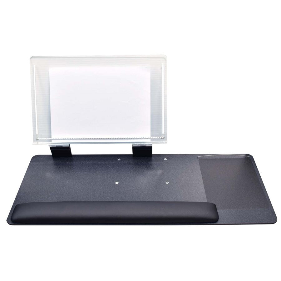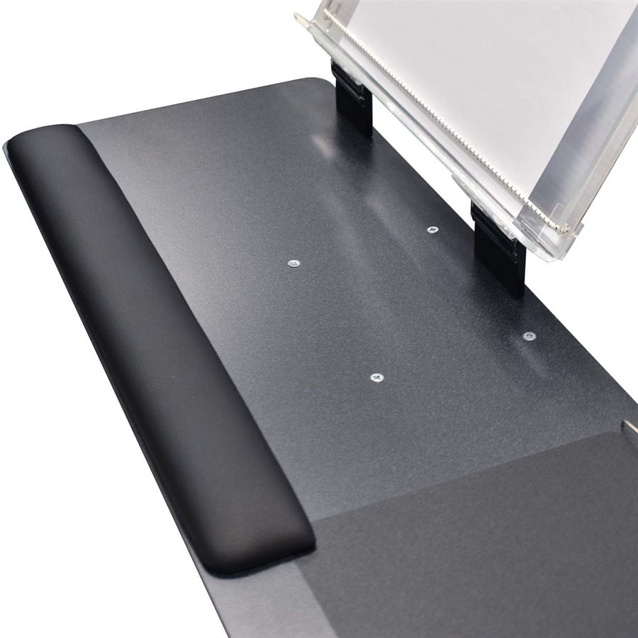 Pour les nouveaux claviers plus minces et moins larges, voici l’ensemble Tiroir à Clavier et Porte copie. Naturellement, vous pouvez ajuster la hauteur du plateau à clavier sans avoir à manipuler aucune manette ou levier. Cet ensemble complet, inclus le plateau, le mécanisme, le repose-poignets et le porte copie.